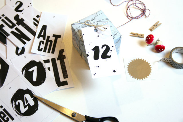 Are you doing an advent calendar? I hope I'll get one this year and to make it a little bit easier (for him) I created some printable hang tags for download. I used my brush-pen again and played with some wooden letters. If you don't mind the german you can get the PDF right here. You just need to print it out and get started.